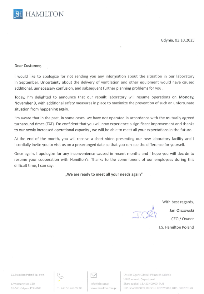 Statement from J.S. Hamilton CEO Jan Olszowski