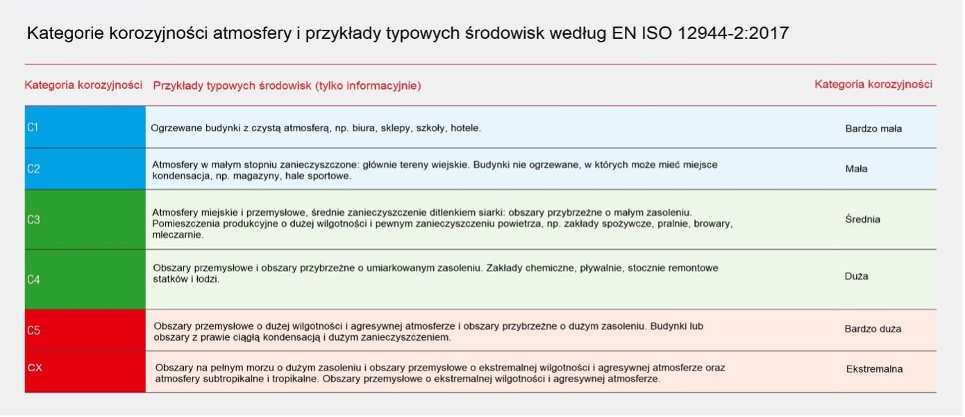 PN-EN ISO 12944-2 klasyfikuje środowiska na kategorie korozyjności atmosfery ( C1-bardzo mała, C2- mała, C3- średnia , C4- duża , C5-I- bardzo duża przemysłowa, C5-M – bardzo duża morska) oraz gruntu i wody (Im1 – woda słodka, Im2 – woda morska lub lekko zasolona, Im3- grunt).